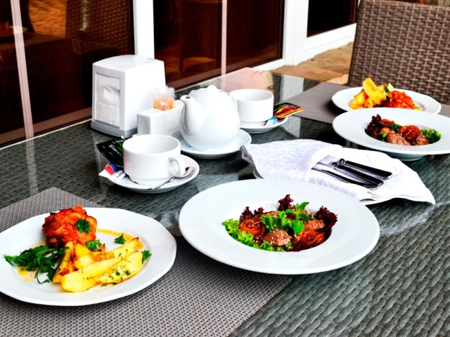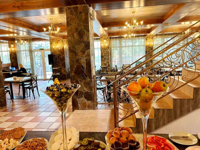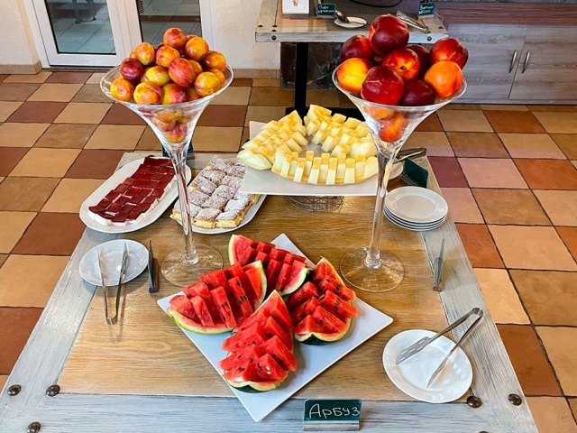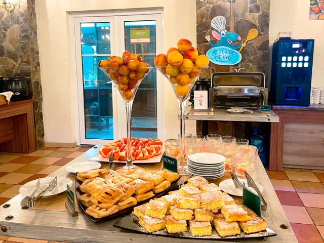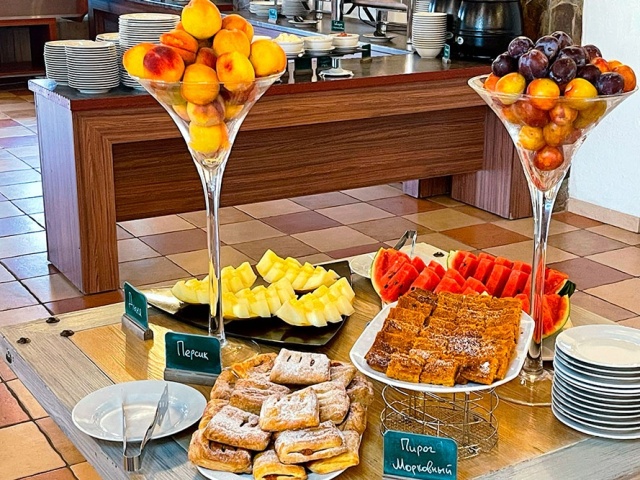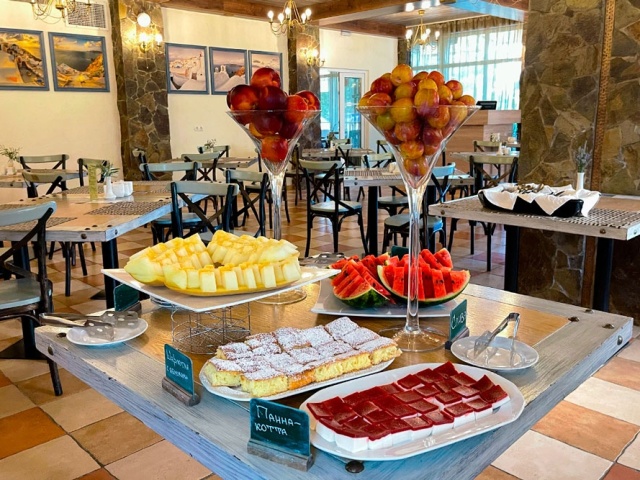Ресторан отеля «Вилла Олива-Арт»★★★ с 8:00 до 10:30 утра ждет гостей на завтрак по системе «шведский стол». В рацион включены полезные молочные каши, лёгкие салаты, блинчики с различными начинками, гастрономическая нарезка от местных производителей, свежая выпечка, крымские овощи и зелень. Из напитков: традиционно хороший кофе, разнообразные виды чая, а также освежающие напитки. В ассортимент завтрака включены: орехи, джемы, сухофрукты, мюсли, сладкие соусы, кисло-молочная продукция.