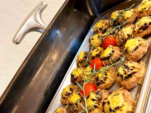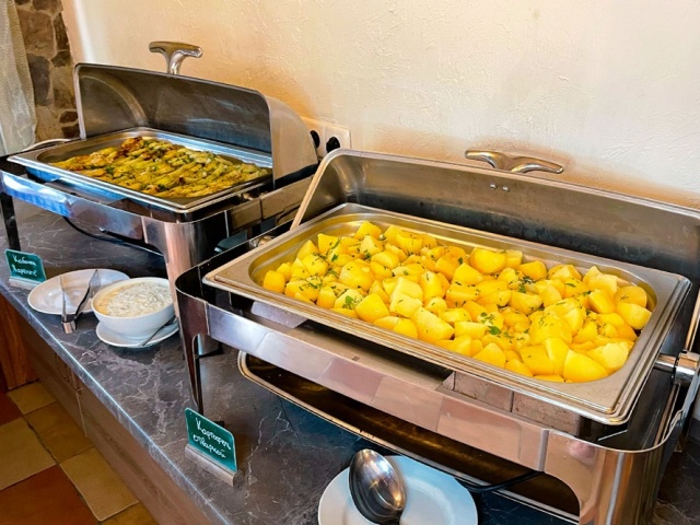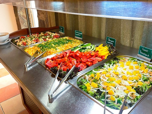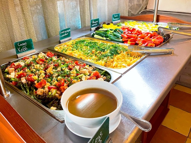 В обед с 13:00 до 15:00 гостей ждут несколько классических первых и горячих блюд, гарниры, салаты, овощные нарезки, фруктовые десерты и выпечка, свежие фрукты и прохладительные напитки. Ужин традиционно проходит в ресторане отеля с 18:00 до 20:00, радует гостей отеля вкусными и полезными салатами, горячими мясными и рыбными блюдами, специальными соусами и напитками. Ежедневно на обед и ужин ко всем блюдам предлагаются вина местного производства, пиво и сидр.